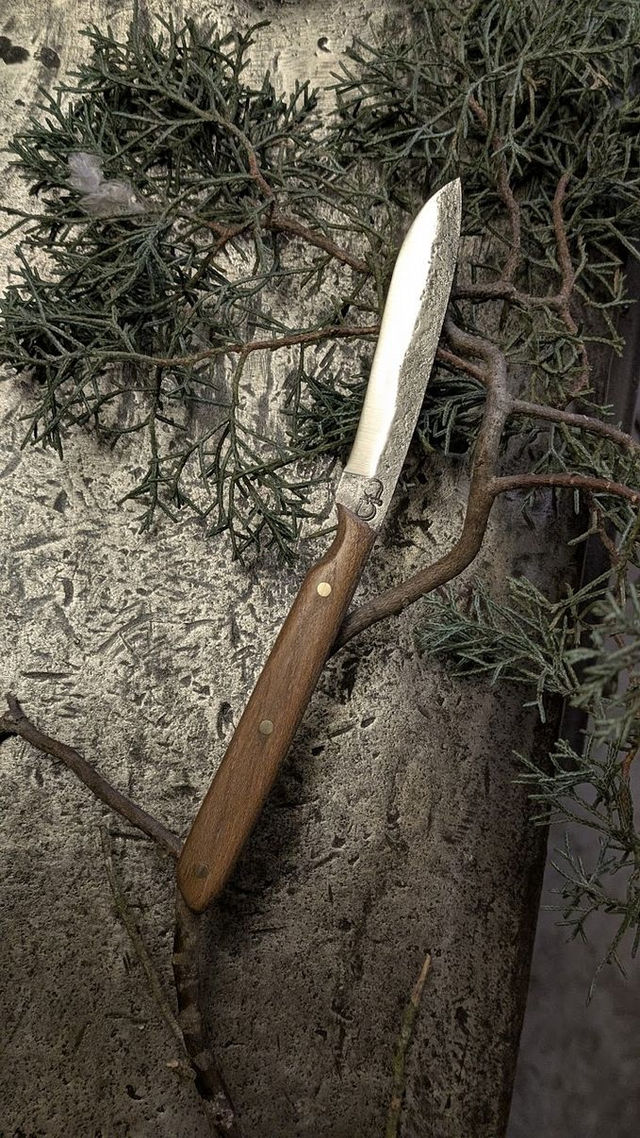 Ce couteau est unique, il n'en existe qu'un seul comme lui. Il a été forgé à partir d'un acier carboné ce qui signifie qu'il va se patiner avec le temps car ce n'est pas un couteau inoxydable. N'oubliez pas que le fait qu'il se patine est tout à fait naturel et cela rendra votre couteau encore plus atypique.